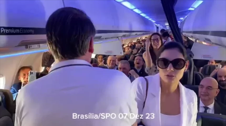 No avião, estão presentes integrantes de sua comitiva formada por deputados, senadores e assessores do ex-presidente, que também assistirão à cerimônia de posse.