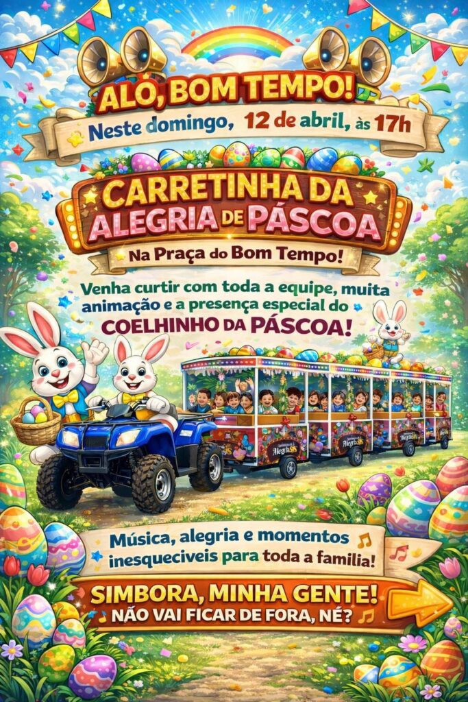No domingo, 12, a partir das 17h, acontece a “Carretinha da Alegria de Páscoa”, na Praça do Bom Tempo, com música, animação e a presença especial do coelhinho da Páscoa.