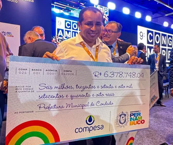 O município de Condado, na Zona da Mata Norte de Pernambuco, garantiu um importante reforço financeiro que deve impulsionar novos investimentos locais. Nesta segunda-feira (27), o prefeito Albino Silva (PP) comemorou o repasse de R$ 6.378.748,00, oriundos da concessão da Compesa. O anúncio foi feito durante o 9º Congresso Pernambucano de Municípios, realizado no Expo Recife, reunindo gestores de diversas regiões do Estado.